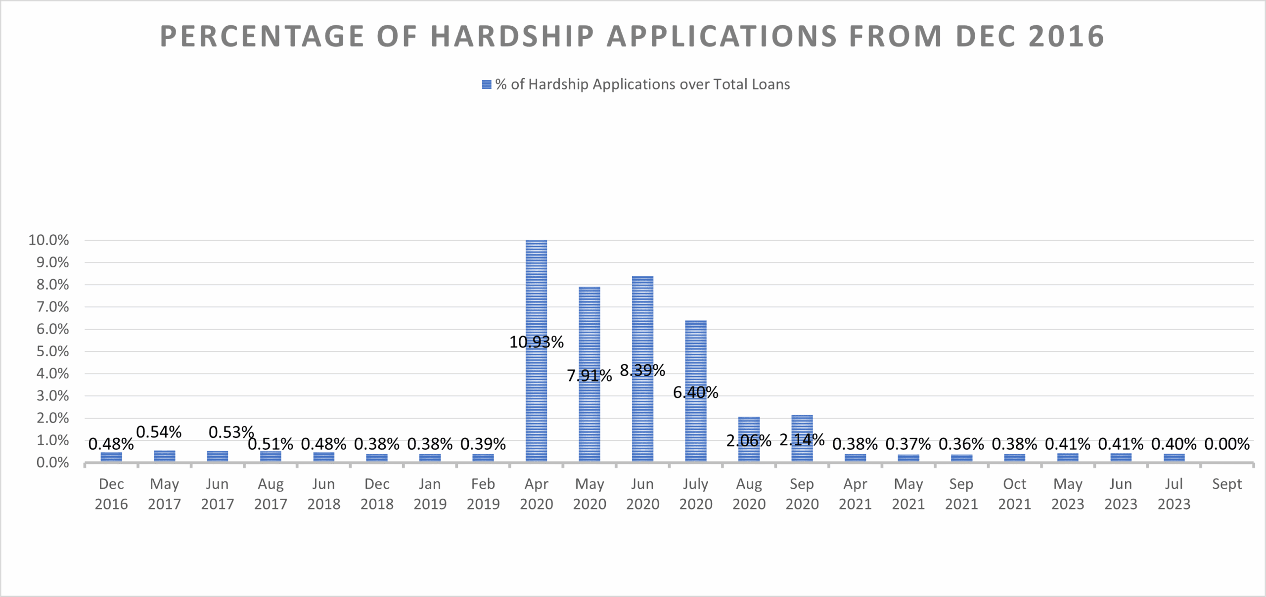 Hardship - 0 Loan representing 0% of the total number of loans. Note where the graph does not show a period, the total hardship number was zero.